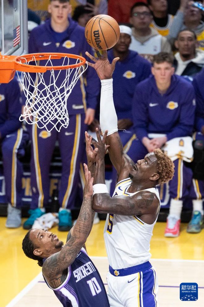 12月28日,湖人队球员八村塁(右)在比赛中上篮受阻。