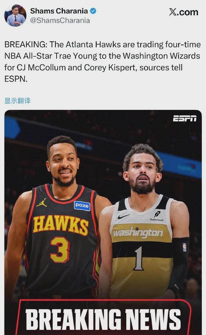 老鹰将27岁的特雷杨送至奇才,仅换回34岁的CJ-麦科勒姆和26岁的科里-基斯珀特,没有选秀权......