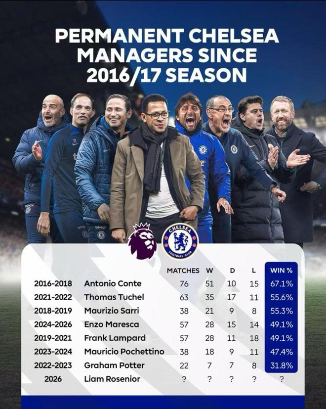 切尔西近10年主帅英超胜率:孔蒂居首波特垫底,马雷斯卡第四